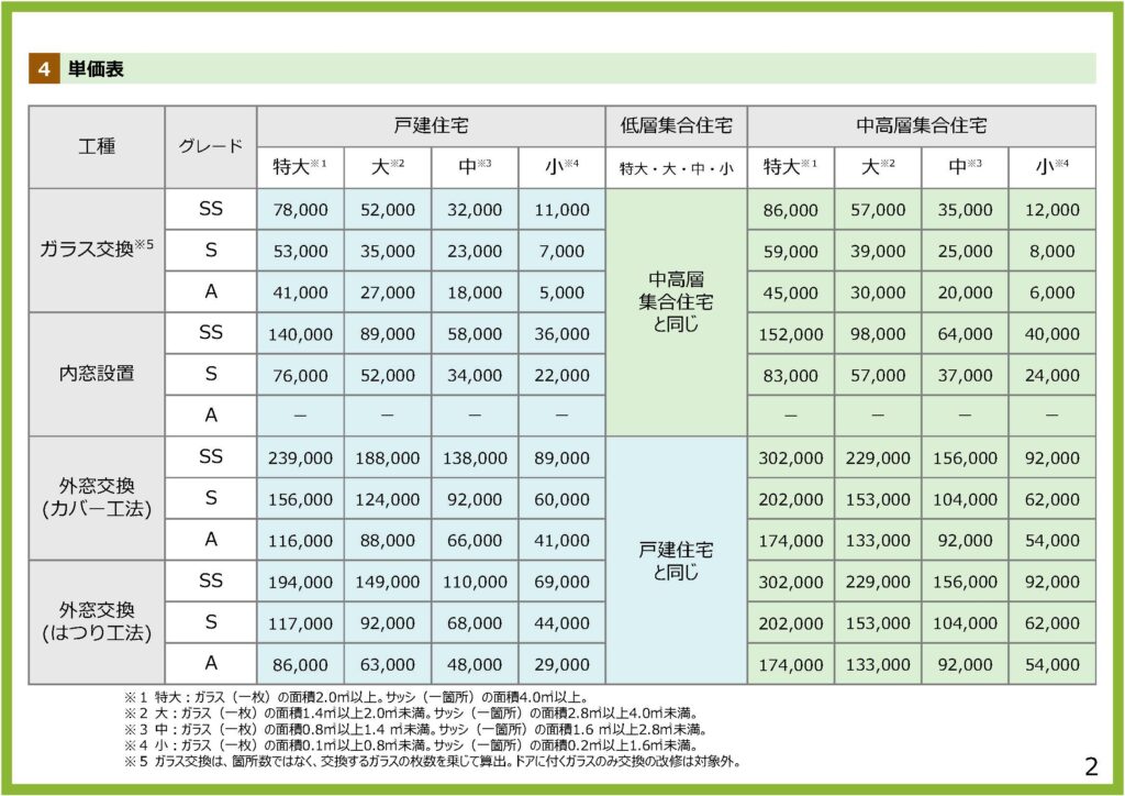 補助金額は工事の種類(ガラス交換、内窓設置、外窓交換カバー工法、外窓交換はつり工法)とグレード、住宅の区分、サイズによって分かれています。
